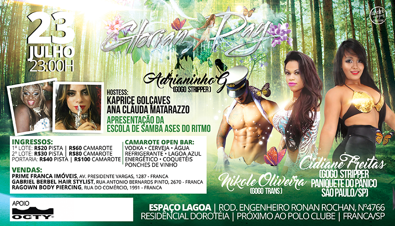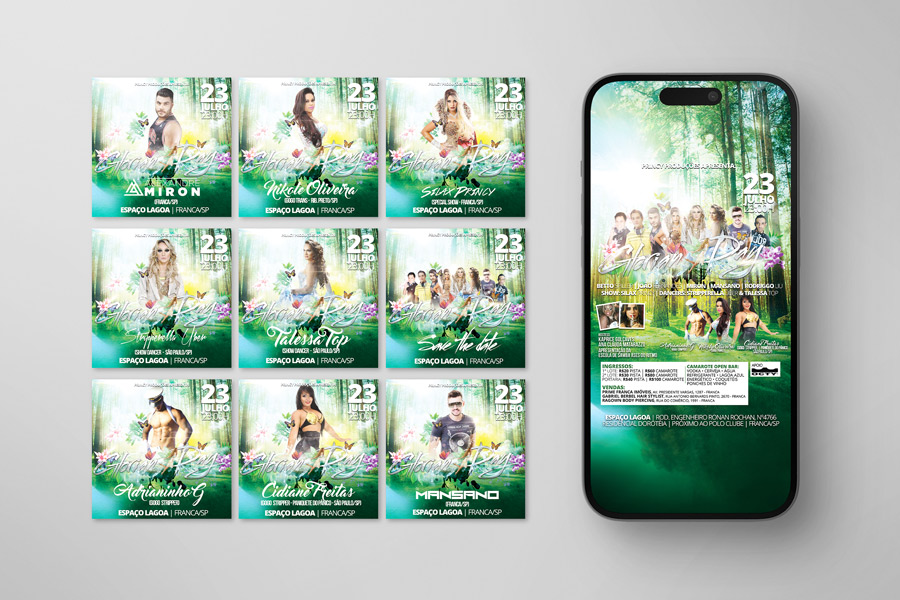As artes captam perfeitamente o espírito de uma “floresta encantada”, combinando elementos naturais com figuras glamourosas e místicas. A sensação é de que ao entrar na festa, os participantes serão transportados para um mundo de fantasia, onde cada detalhe contribui para a experiência mágica. A presença de DJs, dançarinas e outras atrações reforça a promessa de entretenimento de alta qualidade em um cenário de sonho.